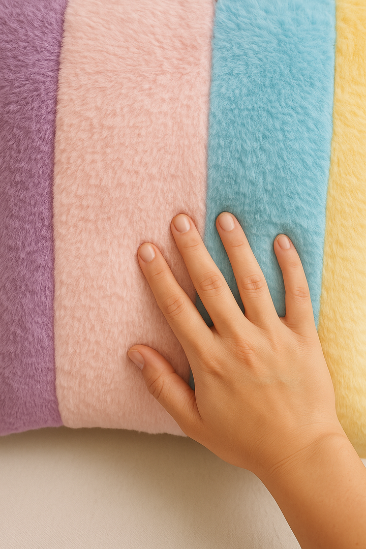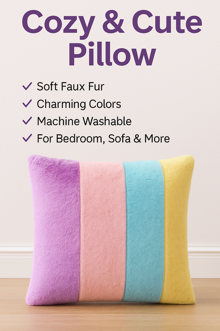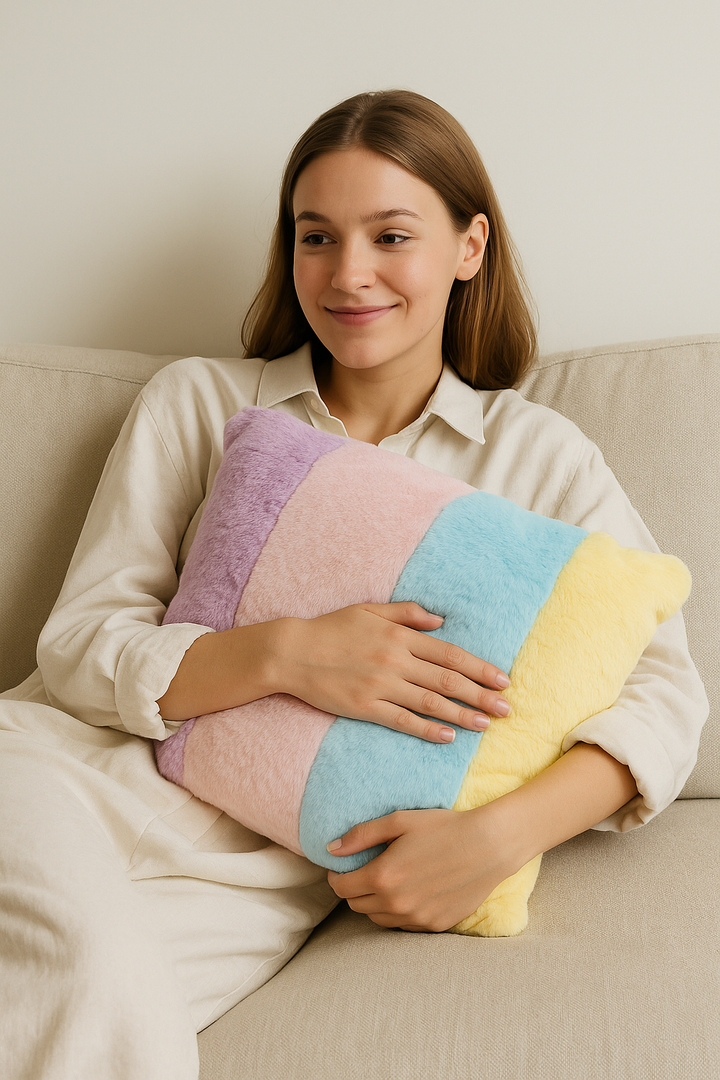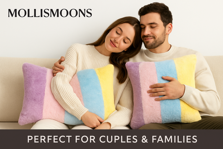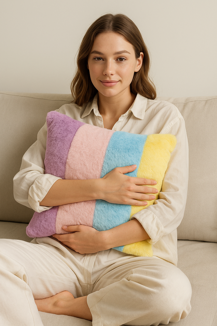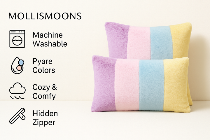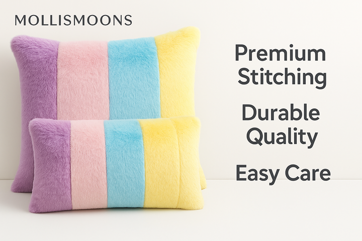 Meet the pastel hug your home has been waiting for. Mollismoons cushions arrive ready to use with premium white fiber filling — no extra inserts, no guesswork. Our signature 4 vertical pastel stripes (Purple • Pink • Sky Blue • Yellow) calm the eyes and cozy up any corner — sofa, bedroom, study or kids' room.